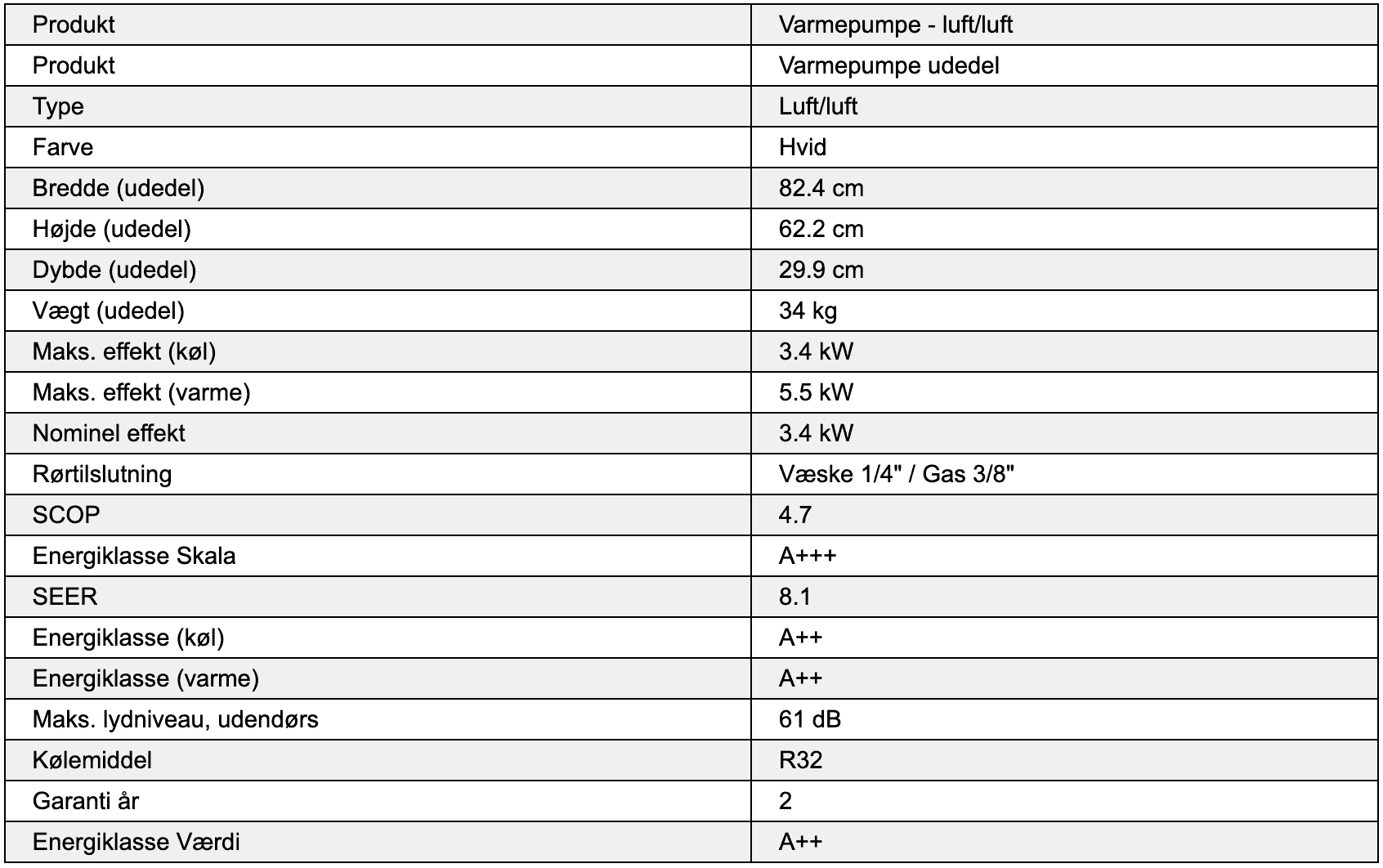 Energiklasse varme/køl A+++/A+++